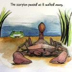 But if you don’t know the story… In the original the scorpion stings the frog in the middle of the river. When the frog asks “why” the scorpion says “it’s in my nature” and they both die. I like my ending more.